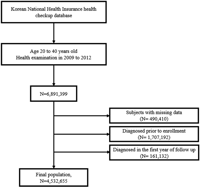 We obtained data from the national health claims database established by the KNHIS. The KNHIS system provides comprehensive medical care covering the entire Korean population and maintains a database of inpatient and outpatient medical records, including diagnostic and procedural codes, demographic data, and prescribed medication claims. The health care records of all Korean nationals are considered highly reliable as health records are tracked using a unique identification number each individual receives at birth, and the KNHIS follows the standard codes of the International Statistical Classification of Diseases and Related Health Conditions, 10th revision (ICD-10). The KNHIS also provides a free general health check-up program and a cancer pre-screening program at various stages of life. All subjects registered in the KNHIS database are advised to undergo national health check-ups every 2 years. The categories of health check-ups include anthropometric data, blood pressure, and laboratory data, such as fasting glucose levels, cholesterol levels, and serum creatinine levels. Using standardized self-reporting questionnaires, data on previous medical history and lifestyle factors, including smoking habits, alcohol consumption, and physical activity, were collected. Therefore, comprehensive information is available on all insured Koreans and their dependents concerning their various health exam results at different ages.