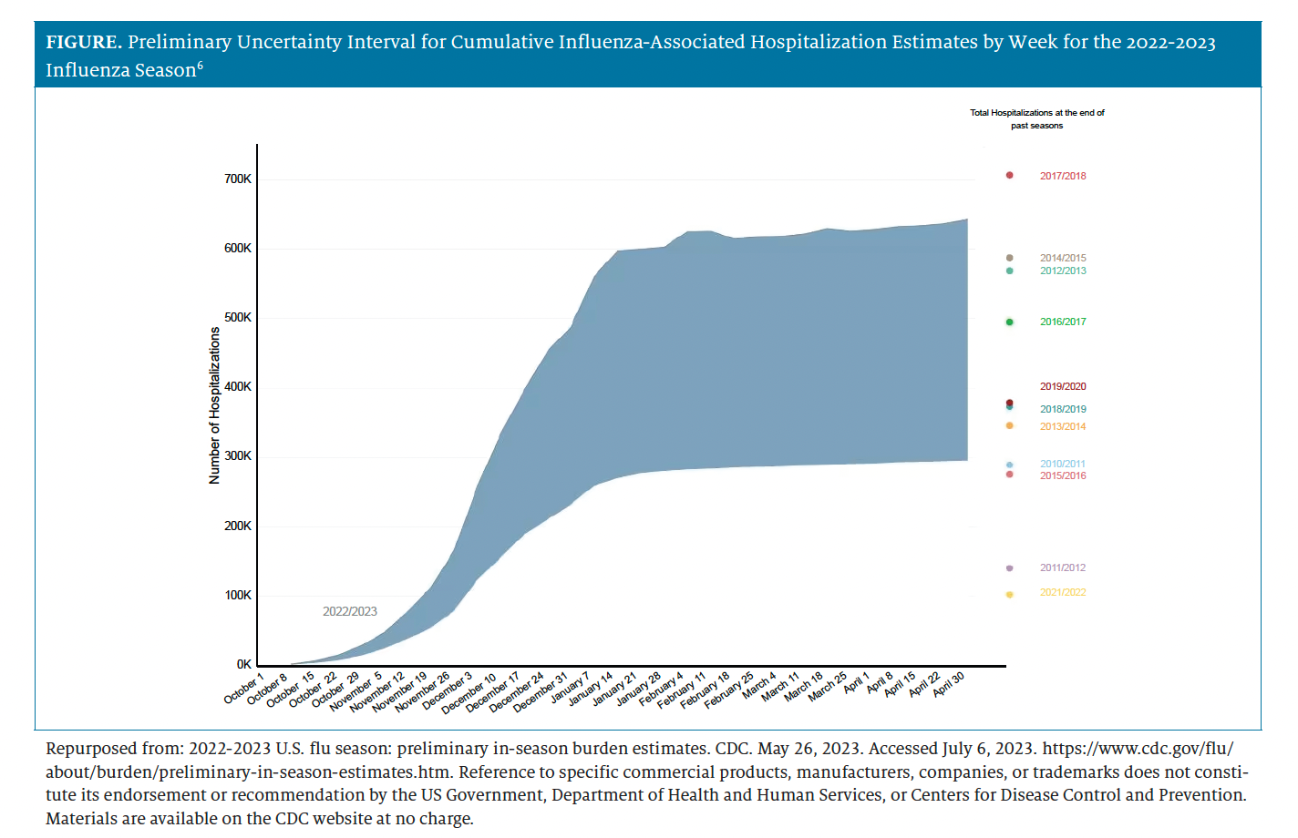 - 2022-2023 U.S. flu season: preliminary in-season burden estimates. CDC. May 26, 2023. Accessed July 6, 2023. https://www.cdc.gov/flu/about/burden/preliminary-in-season-estimates.htm